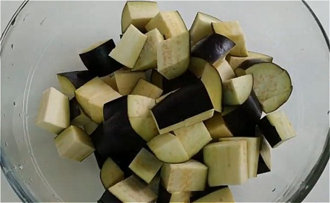 2. Баклажаны нарежьте крупными кубиками, сложите в миску и посолите. Оставьте в таком виде на 30 минут. После этого их промойте.