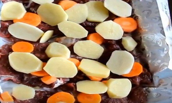 Мясо говядины с овощами сочное и мягкое, приготовленное в фольге