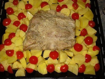 - Картопля та помідори, помийте і наріжте великими кубиками. Розгорніть свинину. На лист викладіть м’ясо, навколо нього розкладете овочі, посоліть і приправте їх до смаку.