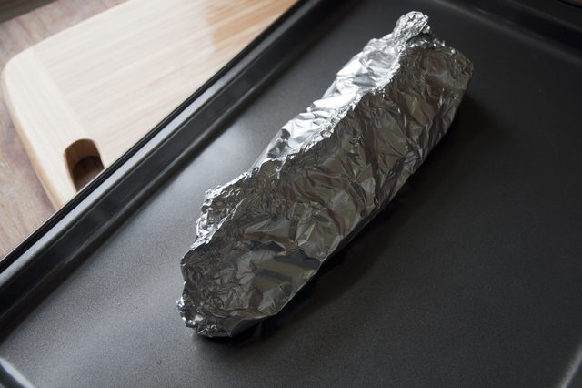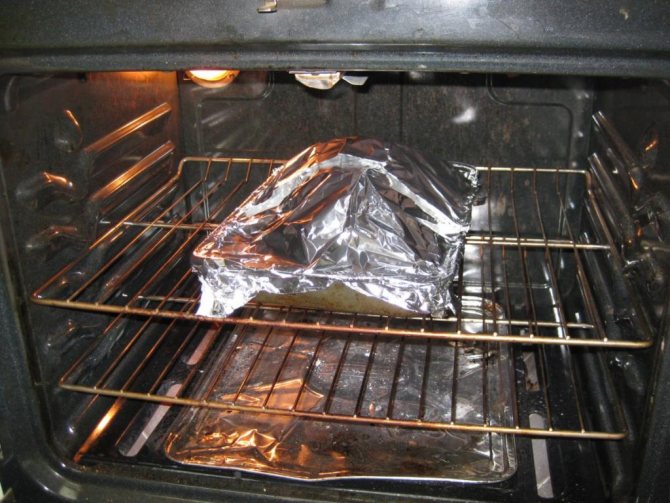 - Після цього оберніть м’ясо у фольгу, помістіть його на лист і відправте в духовку. Запікайте при 250 градусах 45 хвилин.