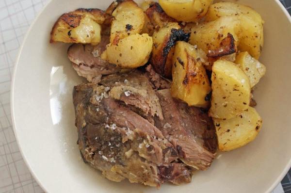Запікати блюдо в заздалегідь розігрітій до 200 ° С духовці. Спочатку готувати 80 хвилин під фольгою, потім ще 20 хвилин уже без покриття, щоби м’ясо і гарнір підрум’янилися.