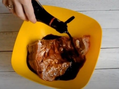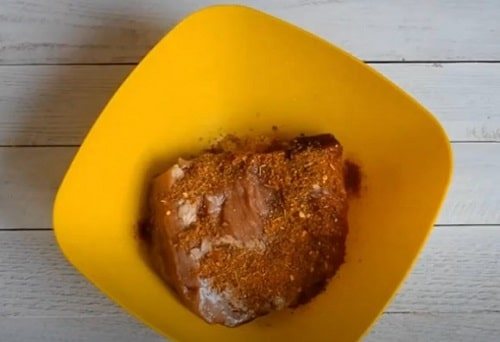 Після закінчення заданого часу вийміть шматок, обітріть його. Посипте приправами для свинини. Масажними рухами старанно утріть у м’якоть. За бажання можна трохи підсолити, але враховуйте, що соєвий соус вже досить солоний.
