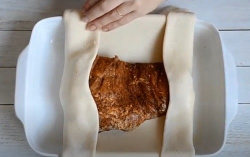 На місці свинини може бути будь-яке м’ясо. Тісто прісне, замішується за лічені хвилини. Воно настільки надійно запечатає шматок м’якоті, що збереже всі соки усередині.