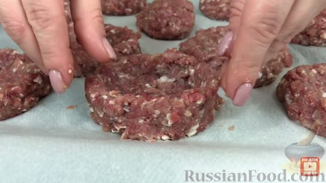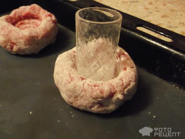 2. Покласти м’ясну кульку на обробну дошку і злегка приплюснути долонею. Банку пива (можна взяти банку коли або круглу склянку) обернути харчовою плівкою або пакетом і поставити посередині фаршу, злегка натиснувши на неї. Акуратно сформувати навколо банки борти, притискаючи фарш руками до банку та повертаючи її. Не бійтеся експериментувати, якщо не вийде, то фарш можна знову сформувати в кулю і почати готувати кошики заново.