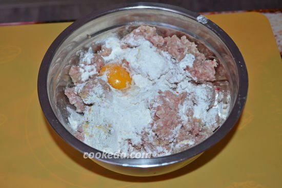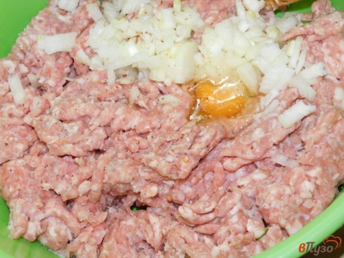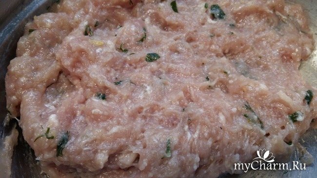Фарш (грам 300) у мене курячий і трохи свинячої+спеції за смаком+яйце і зелень, трохи водички, щоб фарш не був густим.