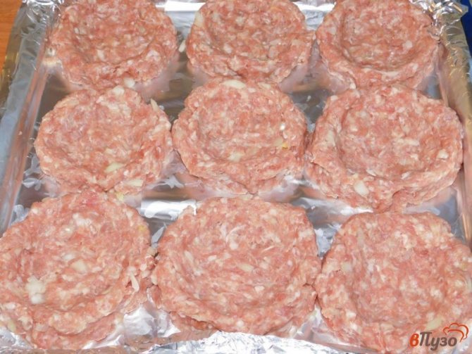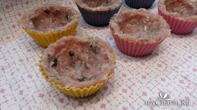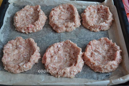 Укладаю фарш у силіконові формочки, формую бортики та заглиблення в середині під начинку.