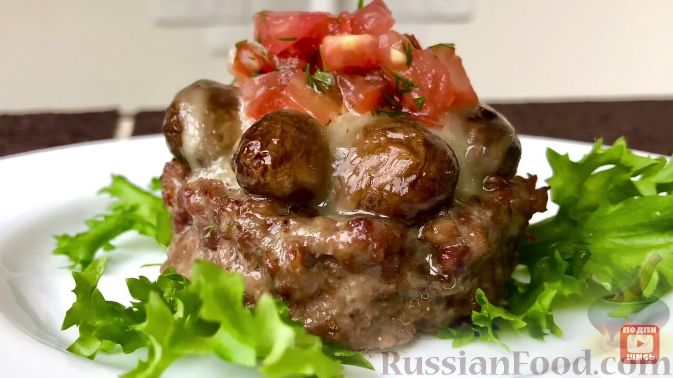 У запечених кошиках з м’ясного фаршу — смажена цибуля та цілі грибочки під розплавленим сиром, а зверху — помідори з часником. Ця соковита, ароматна м’ясна страва стане Вашою коронною, обов’язково приготуйте!