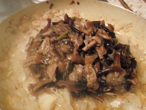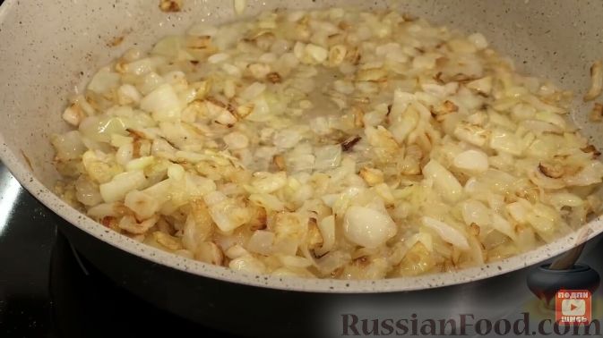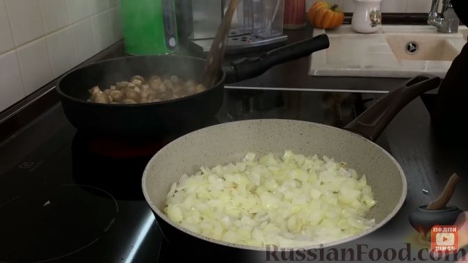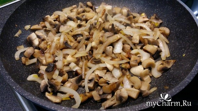Цибулину чистимо і дрібно ріжемо. На олії підсмажуємо спочатку цибулю до золотистого кольору, а потім додаємо гриби, і обсмажуємо все разом.