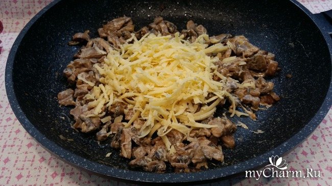 натираю грам 30 сиру і додаю до остиглих грибів, перемішую, готова начинка