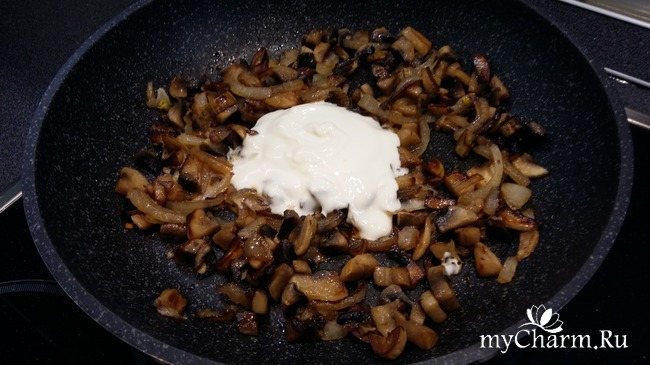 - Поріжте цибулю на дрібні шматочки. Розігрійте сковороду, рясно змастіть її олією. Обсмажуйте курку, гриби та цибулю. На це піде приблизно 10-15 хвилин. Помішуйте і не дайте курці підгоріти. Додайте сметану, смажте ще 2-3 хвилини. Після вимкніть газ і дайте начинці постояти під кришкою приблизно 10 хвилин.