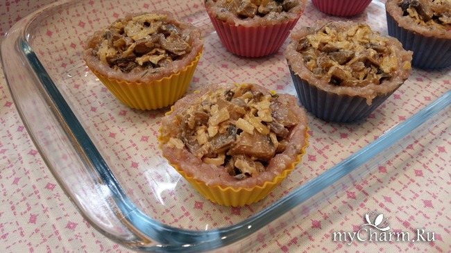 - Кошички запеклися, ось тут я і зрозумів, що змащувати форми все-таки треба – з усіх осередків тарталетки благополучно вивалилися самі при перевертанні, а з двох незмазаних довелося виколупувати.