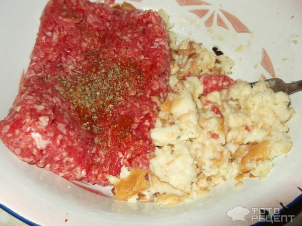 Шматочки білого хліба замочуємо у молоці, віджимаємо та розминаємо вилкою. Змішуємо хліб із м’ясним фаршем. У мене був яловичий фарш, але використовувати можна будь-який фарш на Ваш розсуд.