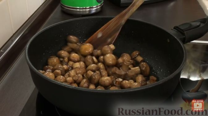 - Поки вариться картопля, займемося грибами. Чистимо, миємо, ріжемо і смажимо в олії. Печериці попередньо відварювати не треба, а лісові гриби варіть, поки вони не опустяться.