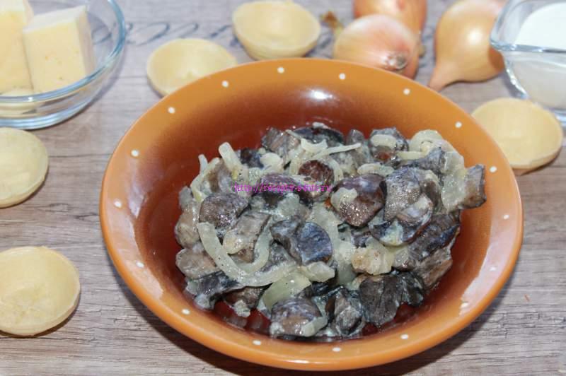 У поглиблення кожного кошика, чайною ложкою, кладемо грибну начинку.