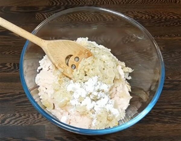 Не забуваємо додати сіль та улюблені приправи до смаку. Готову начинку відставляємо убік, щоб вона охолола, і приступаємо до фаршу.