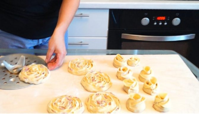 3. Далі розгортаємо тісто в тонкий пласт і розрізаємо на квадрати, розмір визначайте на власний розсуд. На кожен квадратик кладемо начинку і складаємо його навпіл, зліплюючи краї – вийде щось на кшталт невеликої тарілочки. Їх красиво укладаємо в змащену олією глибоку форму і ставимо в духовку на 20-25 хвилин.