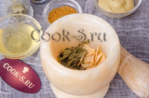 Приготуйте маринад. У ступку складіть сушене листя базиліка та пластинки часнику.