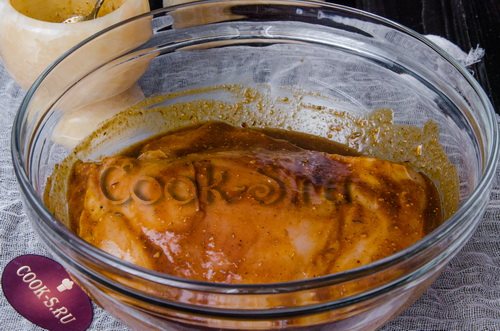 Додаємо до меду з маслом подрібнений свіжий або сухий часник, а також готову гірчицю (гостроту гірчиці вибирайте на свій смак) і спеції. Все добре перемішуємо і залишаємо постояти, прикривши ємність з маринадом харчовою плівкою. Маринаду потрібно постояти близько години, за цей час усі спеції встигнуть «подружитися» між содою, і суміш набуде збалансованого аромату.