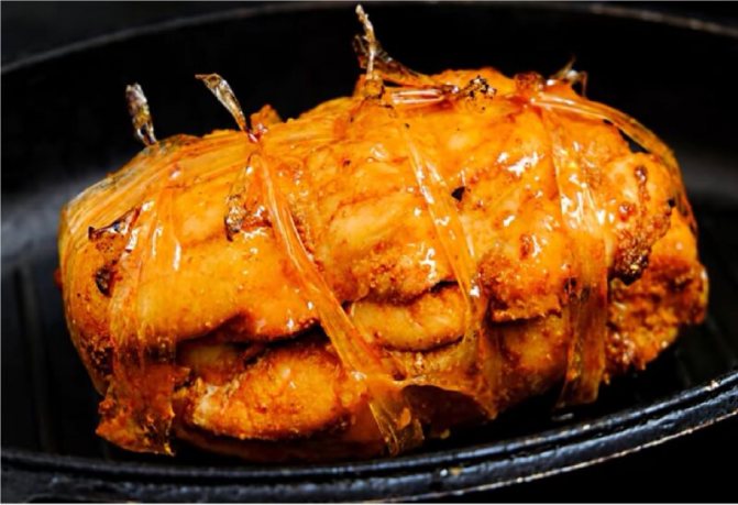 Промариноване філе дістаньте з маринаду і перев’яжіть щільно кулінарною ниткою. Перекладіть пастрому у форму для запікання та накрийте її фольгою. До речі, для запікання краще використовувати скляну форму або металеве глибоке деко, застелене папером для випічки. Якщо запікатимете в керамічній формі, то її обов’язково застелите папером, тому що під час запікання залишки маринаду будуть карамелізуватися і дно такої форми буде складно відмити без пошкоджень поверхні.