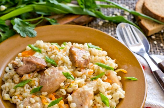 Свинина — довольно жирное мясо, но это пойдет на пользу сухой перловке. Овощи также будут не лишними.