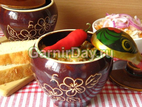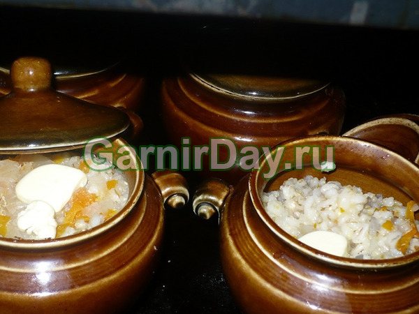 Духовой шкаф должн быть предварительно разогрет до 200 градусов. Горшочки закрываем крышками – и туда. Примерно на полтора часа. Впрочем, процесс приготовления лучше все-таки проконтролировать. Примерно через час загляните в горшочки. Возможно, мясо придется перевернуть, чтобы оно не запеклось сверху. Или водички долить, если крупа все взяла в себя.