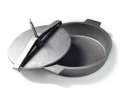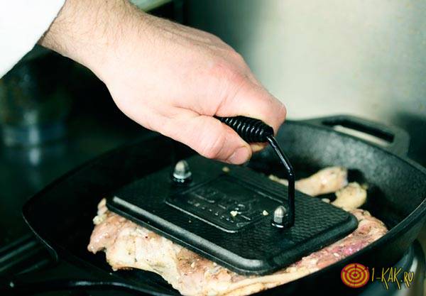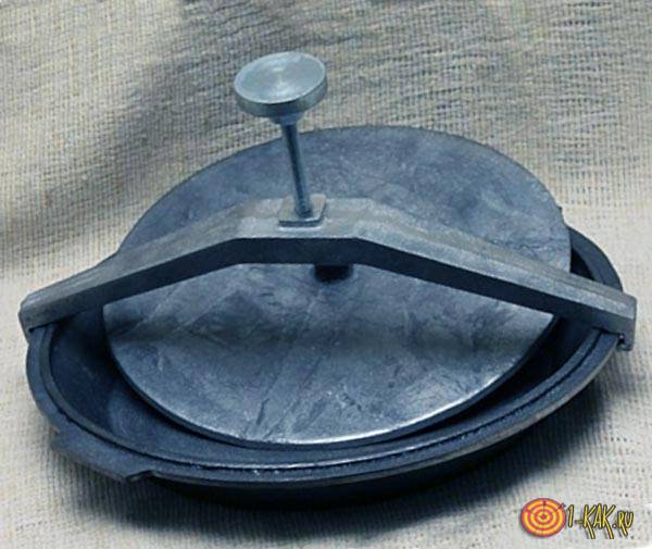 , сделанная из чугуна и имеющая ребристое дно. Вес ее примерно 8 килограммов, все зависит от размера. Главная ее особенность – тяжелая крышка, выполняющая функции пресса. Она плотно прижимает продукт сверху во время приготовления. Многие хозяйки за неимением такой посуды используют обычные сковороды и ставят сверху тяжелые предметы: банку с водой или камень.