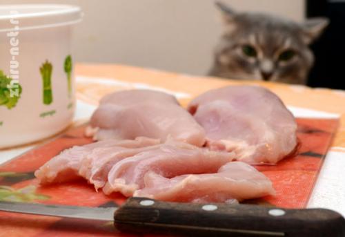 - Куряча грудка промивається, з неї видаляються залишки шкірки, кістки, плівки та жир. Кожна грудка ріжеться на 2 половинки, а потім вони нарізаються впоперек на тонкі слайси, товщина яких не більше сантиметра.
