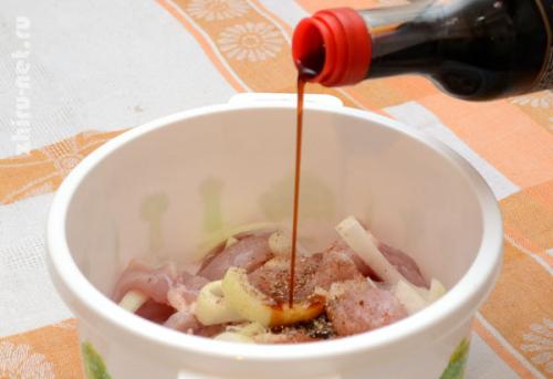 Цибулю шаткуємо півкільцями. Змішуємо в ємності, де грудка буде маринуватися, всі наші компоненти, заливаємо соєвим соусом, бальзамічним оцтом.