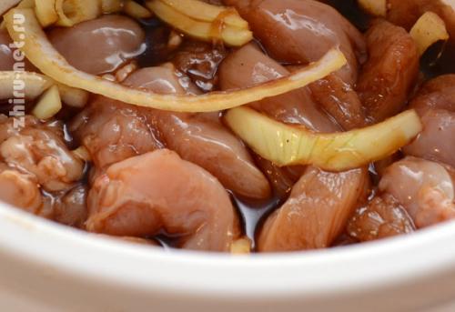 На розігрітій з маслом сковорідці спочатку до золотистого кольору обсмажується цибуля. Після чого він зрушується убік. На сковороду викладається грудка (без маринаду). Смажиться все до випаровування вологи. Після заливається маринад. Вогонь зменшується.