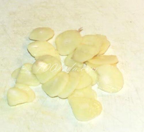 Стегна розрізати приблизно на 3-4 шматочки. Картоплю нарізати “напівшайбами”.