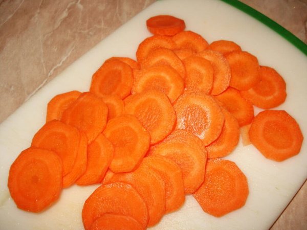 Морквину очистити, нарізати середніми кружальцями. Часник – довільними шматочками. Помідори у власному соку позбавити шкірки, крупно розрізати.