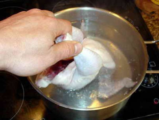 - Після цього опускаємо курча цілком на пару хвилин в киплячу воду, що дозволить закрити на його шкірі пір’я.