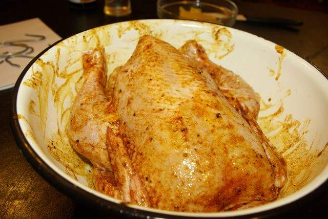 За допомогою пензлика або ганчіркового тампона кілька разів обмазуємо курча з усіх боків.