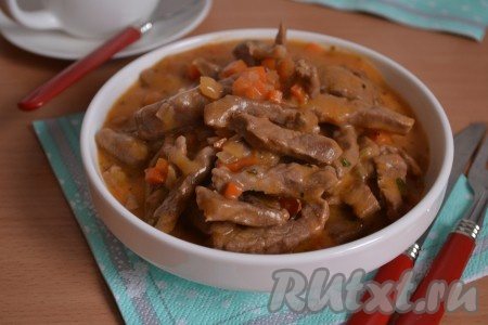 Влити 200 мл води та на слабкому вогні гасити під кришкою до м’якості яловичини. Якщо використовуєте м’ясо молодої тварини, підливу буде готова через 10 хвилин з моменту закипання. В іншому випадку – тушкуйте до м’якості яловичини. Якщо підлива буде досить густою, а м’ясо залишатиметься ще жорстким – долийте гарячу кип’ячену воду і тушкуйте до м’якості.