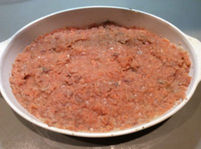 - Залишається перекласти фарш, що вийшов, у велику миску, зручну для змішування, а після – вилити зверху томат-пасту. Не рекомендується в такому рецепті замінювати її на кетчуп.