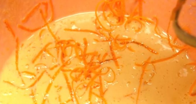 3. Далі до жовтків додати цукор, що залишився, ванілін і перемішати за допомогою міксера до того часу, поки цукор не почне розчинятися в масі. На дрібній тертці натерти цедру 2 великих апельсин і додати сюди.