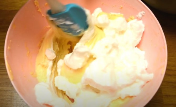 6. У тісто додати збиті раніше білки таким же способом двоетапного внесення. Збити за допомогою лопатки, виделки чи кулінарного віночка.