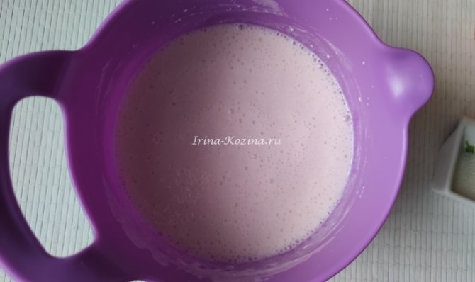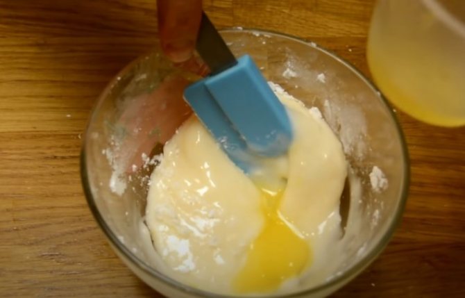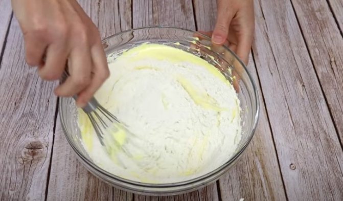 4. У заготівлю внести муку в кількості 120 гр. Ще раз збити віночком до однорідного стану.