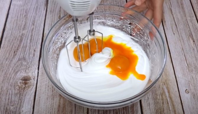 • Жовтки збити міксером. За часом процедура має тривати 4-5 хвилин. Кінцевий результат – жовтки мають стати білими.