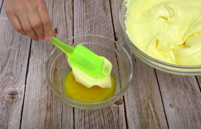 6. Після чого з’єднати дві суміші в одну, в ємності з глибшим діаметром, перемішати.