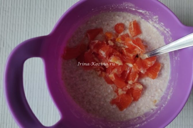 Очищений апельсин поділяємо на часточки і нарізаємо невеликими шматочками. Небагато часточок можна залишити для прикраси запіканки зверху.