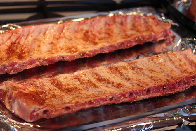 Застилаємо лист фольгою, краще в 2 шари, і кладемо на нього реберця м’ясистою стороною вниз.