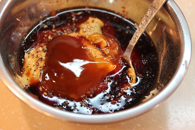 6. Порізаними частинами донизу, занурюємо м’ясо в миску з маринадом. Зверху і по решті частин, які не влізли в масу, добре промазуємо. Важливо, щоб і в зрізи соус теж повноцінно проник.