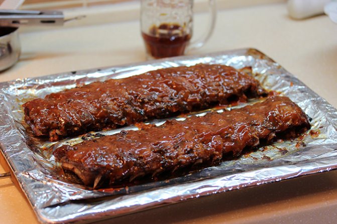 Покладіть ребра у велику сковороду, змастіть соусом і накрийте фольгою. Відправте в розігріту до 200 ° С духовку. Через півгодини залийте ребра залишками соусу.