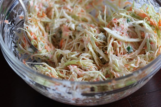 Тепер Колслоу, традиційний американський салат з капусти. Рецептів його безліч, я наведу дуже простий та гарантовано смачний. Кількість продуктів не пишу — залежить від того, на скільки людей розраховано. Знадобиться: