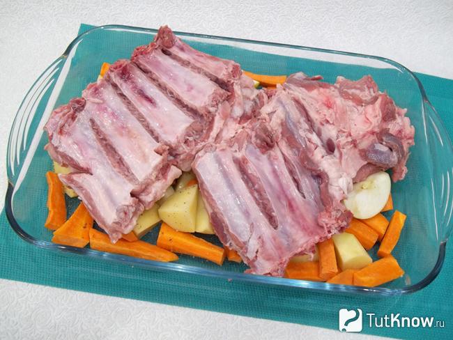 2. Свинячі ребра помийте та висушіть. Покладіть цілим пластом на м’ясо. Під час запікання м’ясний сік стікатиме у форму і просочуватиме овочевий гарнір. Картопля з морквою вийдуть соковитими та смачними. Тому не міняйте місцями розташування продуктів.