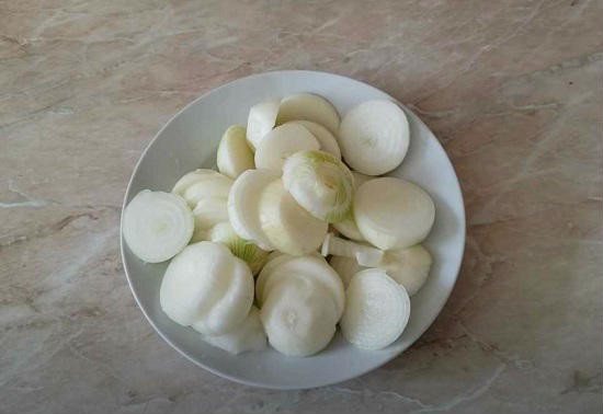 8. Перед запіканням підготуємо цибулю. Його очищаємо та нарізаємо товстими кільцями.