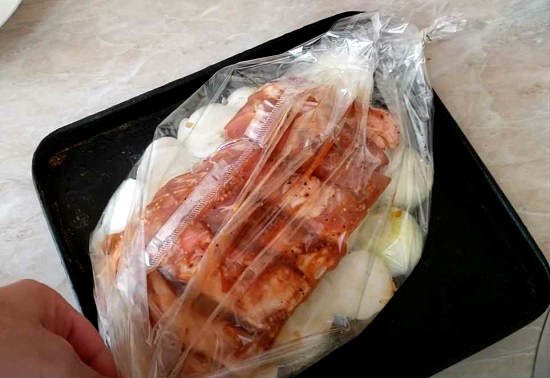 Картоплю нарізати скибочками, посолити, залити олією і посипати прованськими травами. Далі викладаємо його у форму, на ньому робимо подушку з цибулі, порізаної кільцями, і поміщаємо зверху замариноване м’ясо. Все це відправляємо в духовку на годину, накривши попередньо фольгою.