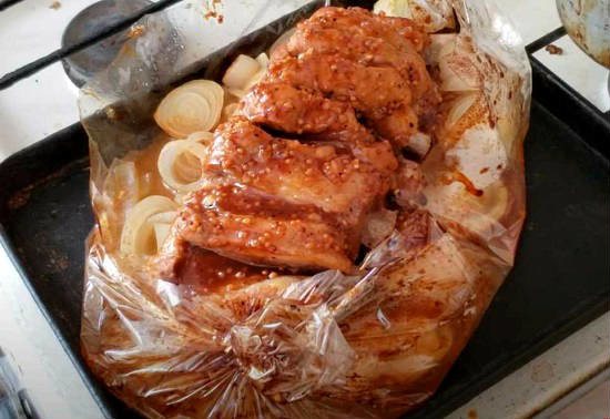 10. У мисці залишився маринуючий склад. Приблизно половину цієї кількості акуратно розподіляємо на реберця. Робіть це столовою ложкою, так зручніше. Потім щільно скріплюємо кінці пакета, попередньо випустивши повітря.