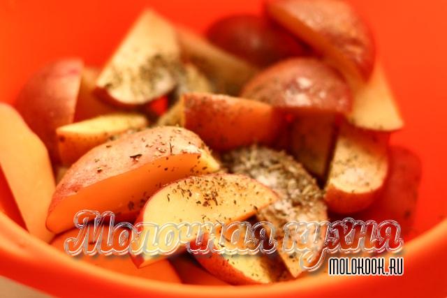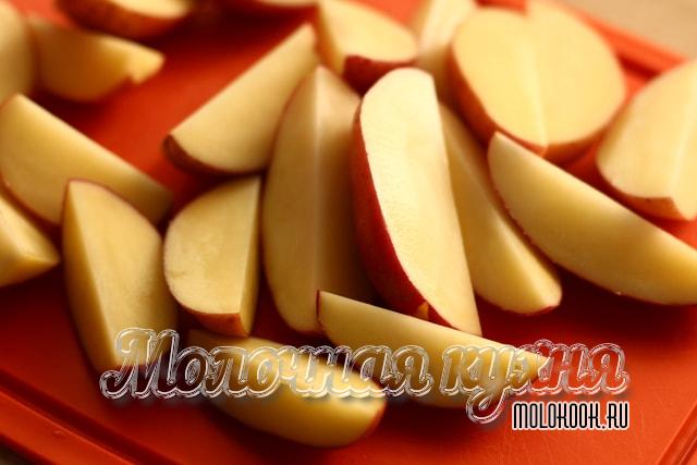 - Картопля добре помити. Якщо шкірка товста та пошкоджена, її потрібно зчистити. В іншому випадку можна запікати бульби, не знімаючи «мундира». Нарізати бульби акуратними часточками, як при запіканні по-сільському.